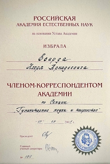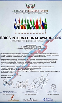 Evard is a laureate of various music competitions and a member of the Union of Composers of Russia. He is also an Honored Figure of the Moscow Musical Society, a Cavalier of the Order of M. Balakirev, and an Honorary Citizen of Russia. He is the founder and president of the international composers' competition Composer XXI and the editor-in-chief of the All-Russian music and information newspaper Let’s Play First. Da Capo al Fine.